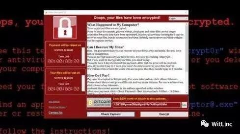 感染WannaCry后,用户的终端与受到大多数的勒索软件侵蚀后一样,会将各类型数据、文档文件加密,被加密的文件后缀名会改成.WNCRY,并索要赎金。