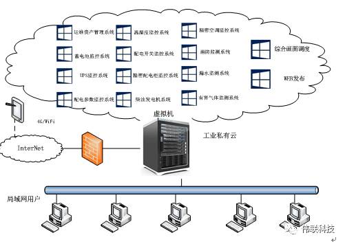 如图所示,在控制中心安装一套WL-820B-B工业私有云,该私有云内含两台高性能工业交换机和三个云节点物理机。在私有云中采用Hyper-V平台虚拟出14台虚拟机,其中12台安装Windows Server 2012R2操作系统并且安装WISCADA工业组态软件作为运维资产管理系统、配电参数监控系统、配电开关监控系统、精密配电柜监控系统、UPS监控系统、蓄电池监控系统、精密空调监控系统、漏水监测系统、温湿度监控系统、有害气体监测系统、消防监测系统、柴油发电机系统的数据采集以及画面显示系统,1台虚拟机安装WiSCADA工业组态软件作为所有子系统的综合调度系统,1台虚拟机安装WiSCADA工业组态软件启用电子地图和P2P内网穿透功能作为WEB端发布中心。私有云网络通过工业防火墙连接到互联网,私有云内配置WEB发布虚拟机连接到互联网。