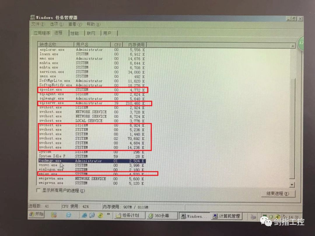 也是该工厂在同一台机器上三个月后中了驱动人生的变种(wmiex.exe),当我们发现该机器运行慢的时候,首先想到的是先到任务管理器查看是什么进程占用了大部分内存和CPU,结果我们在进程里发现了wmiex.exe驱动人生变种。