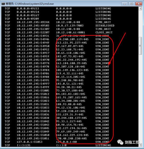通过netstat –an查看网络连接,发现网络不停的对外发送SYN_SENT;端口号均为445端口;